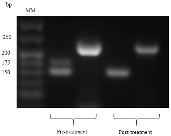 We used an allele-specific polymerase chain reaction (AS-PCR) in order to identify TAC polymorphism at codon 200 in T. colubriformis β tubulin. This polymorphism is responsible for nematode resistance to benzimidazoles. We used the methodology described by [17,18,19]. Two separate reactions were conducted for AS-PCR. The first one was carried out in a volume of 20 µL. We used nuclease-free water (PROMEGA, San Luis Obispo, CA, USA), 100 ng of gDNA, and 1 μL (20 μM) of the following short nucleotide sequences: Pn1 (5′ GGCAAATATGTCCCACGTGC 3′) and Pn2 (5′ GAAGCGCGATACGCTTGAGC 3′). The first PCR (Gotaq (10 µL), Ph1 (1 µL), Ph2 (1 µL), Ph3 (1 µL), PCR product (4 µL) and nuclease-free-water (3 µL)) allowed to produce a template to be used for a subsequent nested PCR where 20 μM of each of the following short nucleotide sequences were used separately: Fw-P1 (5′ GGAACGATGGACTCCTTTCG 3′), Rv-P2 (5′ GATCAGCATTCAGCTGTCCA 3′), and resistance-specific Fw-P3 (5′ CTGGTAGAGAACACCGATGAAACATA 3′). This second reaction allowed for a fragment of 250 bp to be attained. In addition, Fw-P1, Rv-P2, and susceptibility- specific Rv-P4 (5′ ATACAGAGCTTCGTTGTCAATACAGA 3′) were used to get a fragment of 550 bp. We relied on a commercial PCR master mix kit (GoTaq® Green Master Mix, Promega, Madison, WI, USA) for all of the PCR analyses. A C1000 Touch Thermal Cycler (Bio Rad, Ciudad de México, Mexico) was used for all of the reactions, as specified in the following program: denaturation at 94 °C for 5 min, followed by 33 cycles of denaturation at 94 °C for 55 s, annealing at 60 °C for 55 s, extension at 72 °C for 55 s, and a final extension at 72 °C for 10 mins. We visualised the PCR products in a 3% agarose gels stained with ethidium bromide (Sigma-Aldrich, St Louis, MO, USA) using a photodocumenter equipped with UV-light (UVP, Upland, CA, USA).
