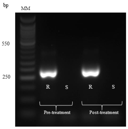 Agarose gel at 3% showing the PCR products of 250 base pairs (bp) that correspond to resistance; R= resistant allele and S = susceptibility allele. MM-molecular marker.