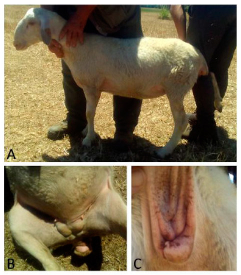 Case 3 was a four-month-old ewe of Sarda breed with a longer ano-vulvar distance and an enlarged clitoris. Two testes-like structures were palpable at the inguinal level (Figure 3).
