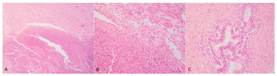 Case 1: The testes were grossly enlarged up to two or three times their normal size (25 × 20 cm). In the cut surface, there was a massive abscess and severe, diffuse, dry, grey-yellow necrosis resulting in the complete destruction of testicular parenchyma (Figure 1C). The epididymis was characterized by foci of diffuse thickening and fibrinous adhesions of the testicular vaginal tunics. Fibrotic tissue was also adherent to the tunic and scrotum. A tubular structure of small diameter with a cul-de-sac end and attached to the testis was observed. This structure was soft at sectioning, and the internal wall showed a diffusely pink surface and no fluid in the lumen (Figure 1D). Histological examination of the testis and epididymis revealed a diffuse area of caseo-necrosis, effacing 98% of the normal architecture and compressing, separating, surrounding and replacing the seminiferous tubules (Figure 5A). Necrotic debris was admixed with degenerate neutrophils, encircled by foamy macrophages (Figure 5B) and occasionally surrounded by granulation tissue and abundant collagen (fibrosis). In the remaining seminiferous tubules, there was diffuse germ cell atrophy with lack of spermatids. Epidydimal epithelia were surrounded by a mild, chronic, inflammatory infiltrate consisting mostly of lymphocytes and associated with severe fibrosis (Figure 5C). Microscopic examination of the tubular structure was interpreted as a uterine tube characterized by an outer layer of connective and hypo-trophic muscle tissue with few vessels and an inner layer compatible with endometrium (Figure 6A). The endometrial tissue was characterized by a stratified epithelium with numerous simple and slightly hyperplastic tubular uterine glands (Figure 6B,C). No ovarian tissue was macroscopically and microscopically visible.