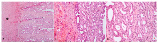 (A) Endometrial tissue characterized by an outer layer consisting of connective and hypo-trophic muscle tissue (asterisk) and an inner layer consisting of stratified pavement epithelium; (B,C) the epithelium was characterized by numerous, simple and slightly hyperplastic tubular uterine glands. Haematoxylin and eosin staining.