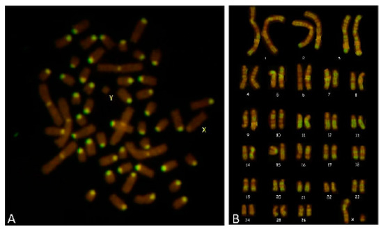 Blood lymphocytes were cultured in RPMI medium (BE12-702F, Lonza, Basel, Switzerland) with Concanavalin A (code no. C2010, Sigma-Aldrich, St. Luis, AZ, USA) and 10% of FBS, Australian origin, (code no. 10099141, GIBCO, New York, NK, USA) for about 72 h at 37.5 °C. Two types of cultures, with and without 5-BrdU (code no. B5002, Sigma-Aldrich, St. Luis, AZ, USA), were set up. A total of 20 µg/mL of 5-BrdU (code no. B5002, Sigma-Aldrich, St. Luis, AZ, USA) and H33258 (40 ug/mL) (code no. B1155, Sigma-Aldrich, St. Luis, AZ, USA) were added to the latter 5 h before harvesting. Colcemid (code no. L0040, Microtech srl, Naples, Italy) was added 1 h before harvesting to all cultures. A hypotonic treatment with 0.075 M KCl (code no. 471177, Carlo Erba, Rodano MI, Italy) and three fixations with Carnoy’s fixative were performed. Cell suspensions were used to prepare slides that were allowed to dry and then stained for C- and R-banding. A total of 200 and 10 metaphases were examined from slides with Acridine Orange staining, treated for C- and R-banding techniques, respectively (CBA and RBA). Karyotypes were arranged according to Cribiu et al. [16].
