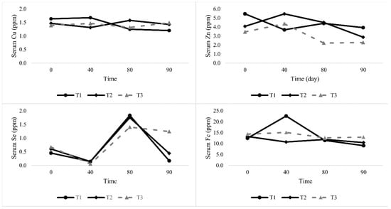Feeding PKC significantly increased Zn and Fe concentrations in the serum and this finding is in line with Abdelrahman et al. []. No difference was seen in lambs receiving the experimental diets (T2 and T3) at day 40 and 80, but for lambs that were fed on T1 for 120 days, serum Zn concentrations increased, while being depressed in the treatment diets. The decline in Zn levels in T2 and T3 could be due to improvements in the immune body of the lambs fed on T2 and T3. Kargin et al. [] noted that Zn is an essential element required for the immunity function to play a role in responding to diseases. Active, synergistic, or antagonistic interrelationships between Fe and other minerals such as Cu and Zn have been documented [,,,]. Throughout the experiment, the content of the serum Fe fluctuated, showing an increasing tendency after 10 weeks of the supplementation treatment. However, statistically significant changes were noted in the lamb group that was given 10% corn supplementation. Accordingly, high intakes of Fe by lambs fed PKC could affect their hormonal activities, and consequently, affect their metabolism and health []. This finding could provide a good indicator of the body health of animals. It has been reported that a high level intake of Cu, Mg, and Zn contributed to reducing the absorption of Fe []. Further, trace minerals like Fe and Mn have also been shown to be Se antagonists [].