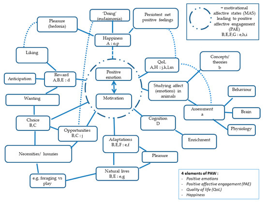 Among the defining features, we noted the centrality of positive emotions to the development of PAW and discussed various possibilities for why this is, including that for some the growing evidence for positive emotions in animals provides the necessary justification for PAW (e.g., [1,2]). Despite the logic of this position we also see risks in too closely defining PAW through positive emotions including that such a focus reduces attention to other important inputs to overall welfare; indeed it begs the question of how positive emotions emerge in the first place. In our synthesis of the interrelationships between PAW and related concepts (see Figure 1), we propose the emotion–motivation nexus (PAE, in brief) as central because it provides both a link between goal-directed behaviours and the emergence of positive emotions, and also provides links between PAW and the wider literature. As examples, PAE clearly overlaps with the happiness components of doing and the resulting experiencing of pleasure; PAE also links to QoL through the FAWC proposal to provide animals with good life opportunities, which effectively is about providing animals with opportunities for PAE [5,9]. We acknowledge that there may be other ways of visualising these interconnections.