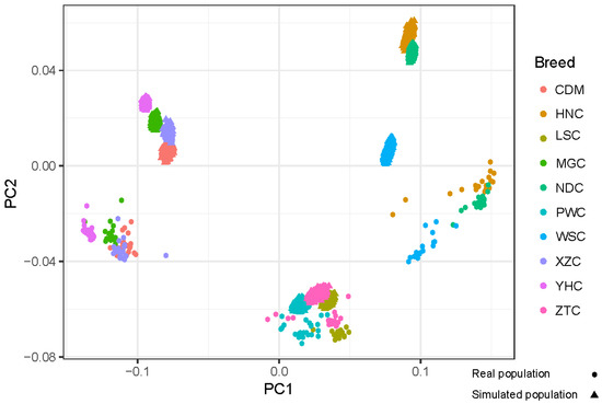 Principal component analysis of the real and simulated populations. MGC = Inner Mongolia cattle, YHC = Yanhuang cattle, CDM = Caidamu cattle, XZC = Xizang cattle, PWC = Pingwu cattle, LSC = Liangshan cattle, ZTC = Zhaotong cattle, WSC = Wenshan cattle, HNC = Hannan cattle, and NDC = Nandan cattle.