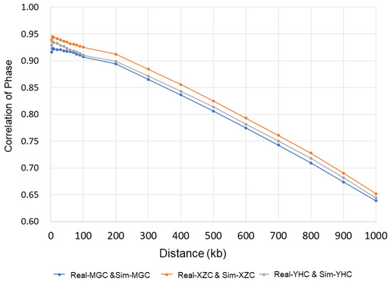 To evaluate the performance of the simulation analysis, we investigated the genomic composition and genetic structure of the real and simulated populations by PCA and persistence of allele phase. The PCA result of simulated analysis was generally consistent with real data (Figure 1), and the simulated population can be divided into three groups using K-means cluster, which included group NCC (MGC, YHC, CDM, and XZC), group SWC (PWC, LSC, and ZTC), group SCHC (HNC, NDC, and WSC). The overall correlation of phase between markers in real and simulated genotypes for each population were high as expected. Phase correlations between SNPs decreased from 0.94, 0.93 and 0.92 (distances of 0–2.5 kb) to 0.83, 0.81, and 0.81 (distances of 400–500 kb) of the real and simulated genotypes for XZC, YHC, and MGC, respectively (Figure 2).
