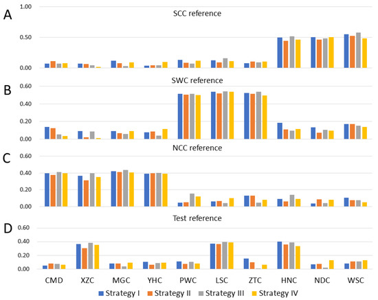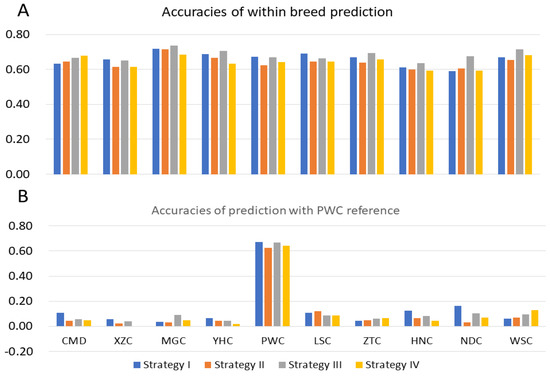 For scenario II, at a heritability of 0.6, the average accuracies of prediction for breeds in reference were larger than those that were not in reference. Figure 4 shows the accuracies of the prediction using three references, which comprised of breeds from each group. When combining three breeds from group SWC (Figure 4B), the average predictive accuracies using four strategies in groups (PWC, LSC, ZTC) were 0.53, 0.51, 0.53, and 0.51, while 0.13, 0.09, 0.09, and 0.09 were estimated for other breeds. When combined three breeds (XZC, LSC, HNC) as reference from different groups, we found the average predictive accuracies using four strategies in reference were 0.38, 0.34, 0.39, and 0.36, while the accuracies for other breeds were 0.09, 0.08, 0.06, and 0.09 (Figure 4D).