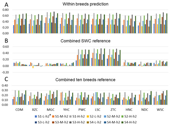 We compared the consequences of alternative heritability of the traits. Figure 6 shows the effect of heritability on predictive accuracy for scenarios of within-breed, admixed reference, and 10-breeds mixed reference. When the heritability increased, the accuracy increased in all breeds for each scenario. The average accuracies of prediction for within-breed reference were 0.29, 0.48, and 0.66 for heritability 0.1, 0.3, and 0.6, respectively. When group SWC was the reference, the predictive accuracies for SWC were 0.21, 0.37, and 0.52, respectively, for three heritability values, while the average predictive accuracies for other breeds were 0.03, 0.07, and 0.10. For heritability 0.1, 0.3, and 0.6, the predictive average accuracies for 10 breeds were 0.11, 0.17, and 0.26 using the reference of combined 10 breeds.