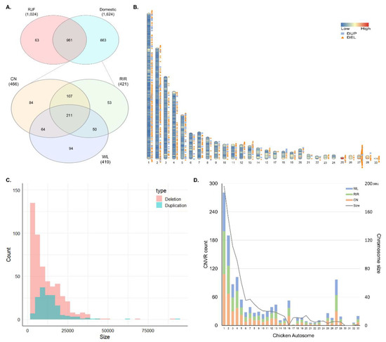 General description of the identified copy number variation regions (CNVRs). (A) Venn diagram for overlapping CNVRs between Red Jungle Fowl (RJF) and domesticated breeds (above), and among Cornish (CN), Rhode Island Red (RIR), and White Leghorn (WL) (below); (B) distribution of CNVRs on chromosome ideogram according to their state (deletion and duplication). This was drawn using Rideogram R package. The color painted on the chromosome represents the gene density; (C) distribution of CNVRs size by state; (D) chromosomal distribution of CNVRs for three chicken breeds and length of chicken autosome.