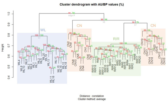 - Suzuki, R.; Shimodaira, H. Pvclust: An R package for assessing the uncertainty in hierarchical clustering. Bioinformatics 2006, 22, 1540–1542. [Google Scholar] [CrossRef]