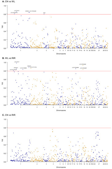 Manhattan plot of genome-wide genes’ VST value. (A) CN vs. WL; (B) WL vs. RIR; (C) CN vs. RIR. The red line represents 0.79 VST.
