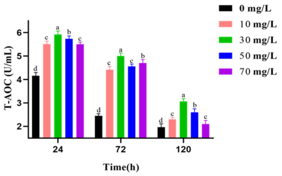 The effects of varying GSPE concentrations on T-AOC of goat sperm activity during liquid storage at 4 °C are shown in Figure 1. The results show that T-AOC was spontaneously decreased with preservation time. GSPE greatly boosted T-AOC from 24 h to 120 h. In particular, T-AOC was best preserved in the 30 mg/L GSPE group.