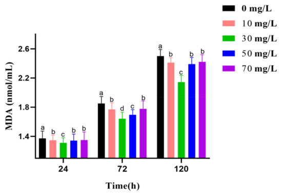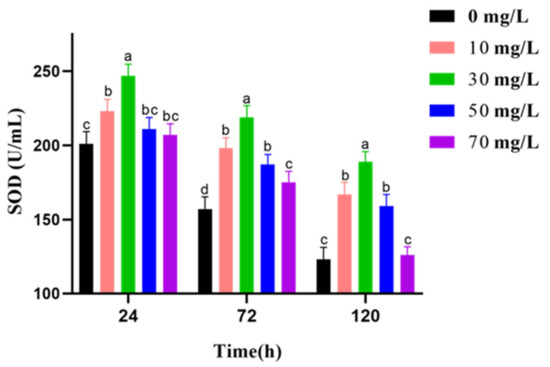 The effects of varying GSPE concentrations on the SOD activity of goat semen activity during liquid storage at 4 °C are shown in Figure 4. The results showed that the SOD activity decreased with prolonged preservation. GSPE therefore enhanced the increase in SOD activity in respective preservation phases. Nevertheless, SOD activity in the GSPE (30 mg/L) groups is highest between 24 h and 120 h.