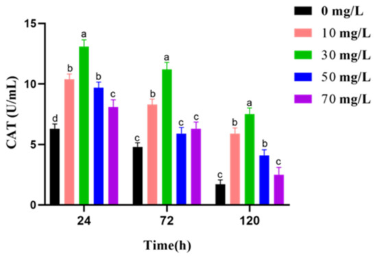 In Figure 3, CAT activity shows a slight decline with prolonged the preservation. However, the treatment groups show more higher CAT activity than control groups in respective preservation time. Most importantly, the activity of CAT is highest in the 30 mg/L GSPE group at 24 h, 72 h, and 120 h.