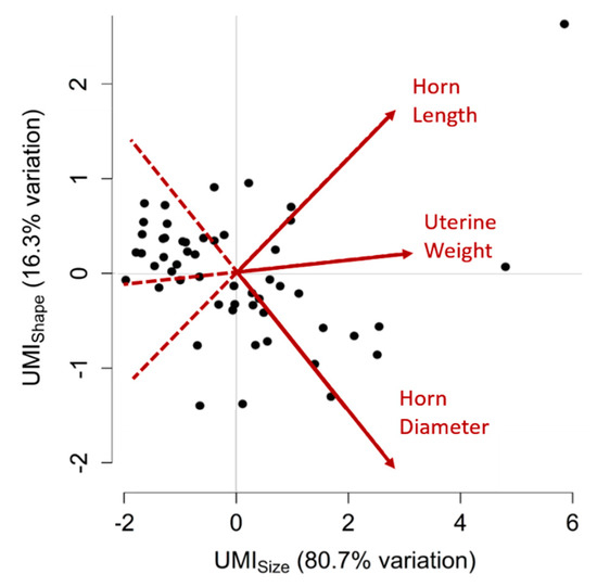 Principal component analysis for uterine traits. Two variables, or Uterine Mass Indices (UMIs), UMIsize and UMIshape, were created to summarise uterine weight, horn length and horn diameter measurements for each gilt. The two UMIs cumulatively account for 97.0% of the variation observed between uteri. Higher UMIsize values correspond to uteri with greater uterine weight, horn length and horn diameter, whereas higher UMIshape values correspond to uteri with greater horn length and uterine weight and lesser horn diameter. Each point on this graph represents a uterus, plotted according to their two UMI values. Points distributed towards the arrowheads of the red vectors have greater measurements of the corresponding uterine trait (labelled in red) than points located towards the tail-end of the vectors. Positively correlated traits have vectors that point in the same direction, negatively correlated traits have vectors that point in opposite directions and traits that have no correlation have vectors that are perpendicular to each other.