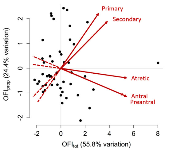Principal component analysis for ovarian follicle counts. Two variables, or Ovarian Follicle Indices (OFIs), were created to summarise the primary, secondary, preantral, antral and atretic follicle counts of each gilt. This graph shows two OFIs that were created, OFItot and OFIprop, which cumulatively explained 80.2% of the variation in follicle populations observed between gilts. Each point on this graph represents an individual gilt, plotted according to her two OFI values. Gilts with higher OFItot values have greater follicle numbers of all types, whereas gilts with higher OFIprop values had greater primary and secondary follicle counts and lesser preantral, antral and atretic follicle counts. Points distributed towards the arrowheads of the red vectors have greater counts of the corresponding ovarian follicle type (labelled in red) than points located towards the tail-end of the vectors. Positively correlated traits have vectors that point in the same direction, negatively correlated traits have vectors that point in opposite directions and traits that have no correlation have vectors that are perpendicular to each other.