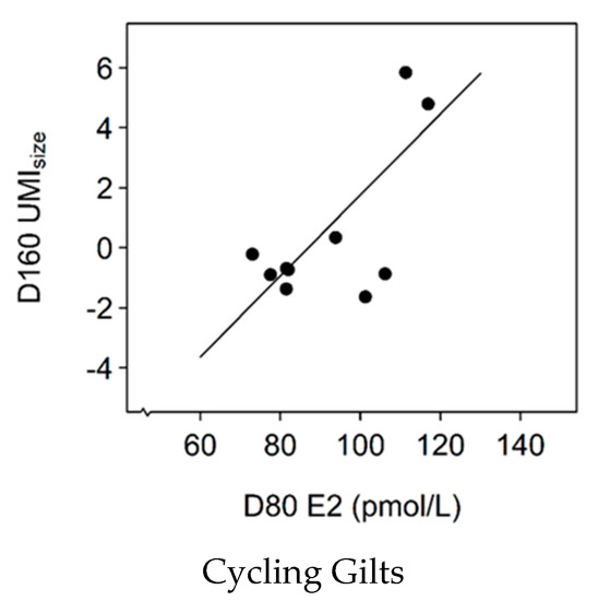 There was a two-way interaction effect between pubertal status and D80 E2 on D160 UMIsize. There was a positive, linear association between D80 E2 levels and UMIsize in cycling gilts at D160 (Figure 3; slope = 0.13, SE = 0.03, χ2(1) = 13.7, p < 0.001) but there was no relationship between D80 E2 levels and UMIsize in gilts that were non-cycling at D160 (p > 0.05).