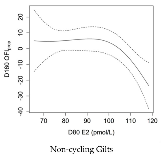 Smoothing spline showing the relationship between serum oestradiol (E2) levels at 80 days of age (D80) and the Ovarian Follicle Index of follicle proportion (OFIprop) values in non-cycling gilts at D160 with Bayesian confidence intervals. Greater serum E2 levels corresponded to lower OFIprop values (p = 0.027, Adj-R2 = 0.14), which represents ovaries with a smaller ratio of primary and secondary follicles to preantral, antral and atretic follicles.
