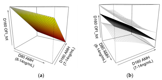 A three-dimensional smoothing spline model showing (a) the two-way interaction effect between serum anti-Müllerian hormone (AMH) levels at 80 (D80) and 160 days of age (D160) on OFItot in non-cycling gilts at D160 (p = 0.045, Adj-R2 = 0.12). This relationship is also shown (b) with standard errors (in grey), rotated for perspective. Pubertal status was determined by the presence of corpora lutea at D160. Non-cycling gilts with both lower D80 and D160 AMH levels had greater OFItot values. Greater OFItot values correspond to gilts with greater overall follicle counts (primary, secondary, preantral, antral and atretic).