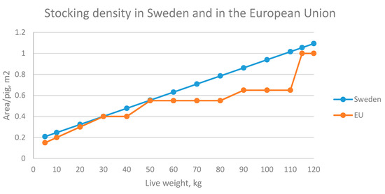 European Union legislation determines stocking density depending on weight categories and is presented in Figure 1 [13,42]. Swedish legislation regarding stocking density for growing pigs is instead determined by the actual LW of the pigs in the pen by the formula 0.17 + (live weight (kg)/130) [25]. In reality, this means that pigs reared under minimum requirements in other EU countries have less space than pigs reared under minimum requirements in Sweden until they reach slaughter at ~110 kg LW (Figure 1). The difference in stocking density between Swedish and EU legislation is largest at around 80–110 kg LW, which is also the period when most tail biting occurs [13,25]. According to the Swedish formula, 0.78 m2/pig needs to be provided for pigs at 80 kg LW and 0.94 m2/pig at 100 kg LW in Sweden. To fulfil this requirement, pigs are kept in pens of 0.8–0.9 m2/pig from the beginning of the finishing period (at approx. 30 kg LW). Pigs from the same batch are sent to slaughter on different occasions. After approximately 60–70 days, the largest 1–2 pigs in each pen are sent to slaughter. The same procedure is repeated two to three times until at last all remaining pigs are sent to slaughter. So if 13 pigs are put in the pen in the beginning, only 10 or less are left at the end of the rearing period. According to EU Council Directive 2008/120/EC, other parameters such as stocking density should be revised before tail docking is carried out [13]. The extent to which stocking density is manipulated to prevent tail biting in commercial production is unknown [13]. With an increasing number of piglets born and weaned from today’s highly prolific sows, all available space is typically already in use. Hence, reducing stocking density is difficult unless farmers are willing to reduce the actual number of sows in production (fewer pigs per unit area) or build new facilities (more space per pig).