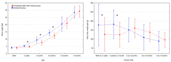 Body weight and daily body weight gain of kids (shown as means and SD) during the study period. The difference significant at α = 0.05 is indicated by an asterisk (*).