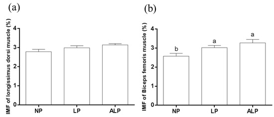 The IMF content of biceps femoris muscle with the LP and ALP diets was higher than that with the NP diet (p < 0.05) (Figure 1). No differences (p > 0.10) in the IMF content of longissimus dorsi muscle were found among the NP, LP, and ALP treatments.