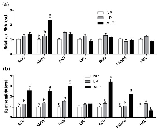In the longissimus dorsi muscle, there was no difference in mRNA levels of ACC, FAS, LPL, SCD, FABP4, and HSL among the groups (P > 0.05). The ALP group showed a higher level of mRNA for ADD1 than the other two groups (P < 0.05).