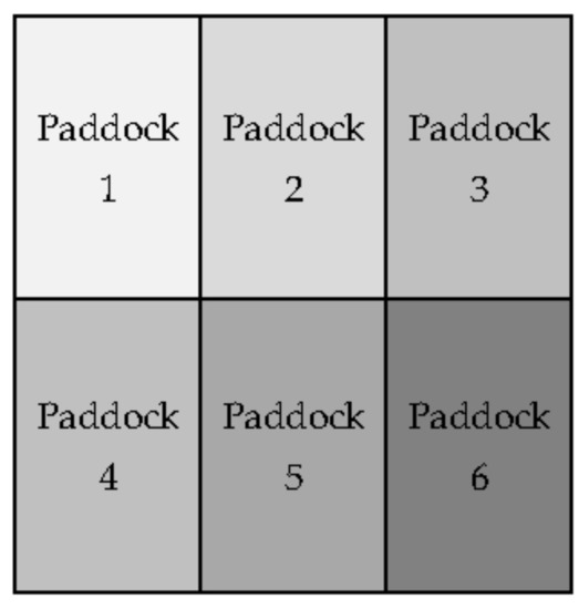 A total of 84 bulls were managed in six groups of 14 in a four paddock rotational grazing system. The paddock set up consisted of four blocks of six paddocks, with all six groups being grazed within one block of paddocks at a time (Figure 1). The boundaries of the paddocks were determined by electric fencing. As part of a wider production study, the six groups were offered one of three summer diets; (i) grazed grass only, (ii) grazed grass with 2 kg concentrate supplementation, and (iii) grazed grass with ad libitum access to concentrates. The chemical composition of grass was determined via NIRS analysis, and that of concentrates was determined by wet chemistry analysis.
