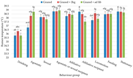 Interaction between behaviour and diet for bulls on Study 1: at grass; a–g represent significant differences (p = 0.047) between behaviour groups.