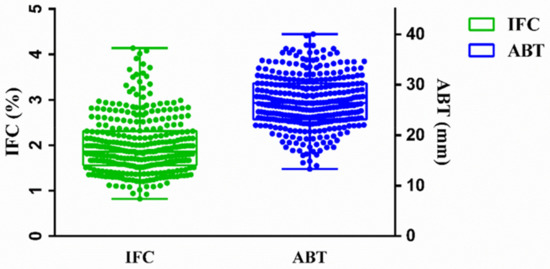 Descriptive statistics for IFC and ABT of 330 Suhuai pigs are shown in Figure 2 and Table 1. The means of IFC and ABT were 1.99 ± 0.03% and 26.68 ± 0.28 mm, respectively. The medians of IFC and ABT were 1.86 % and 26.40 mm, respectively. The CVs of IFC and ABT were 31.21% and 19.36%, respectively.