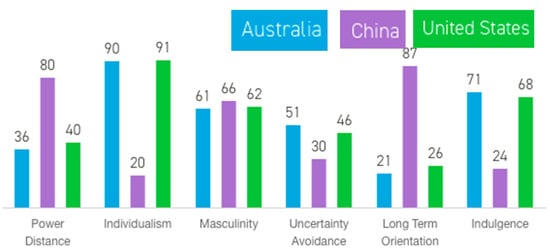 Comparison of cultural dimensions between China and ‘western’ countries, Australia and the United States. Data and graph from ‘Hofstedes Insights’ (www.hofstede-insights.com [5]).