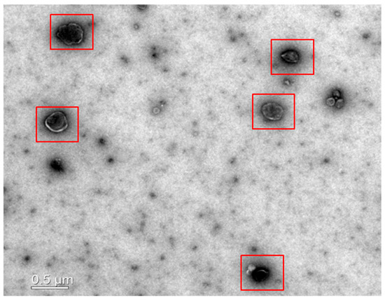 Transmission electron micrograph showing exosomes (red boxes) isolated from conditioned medium derived from canine adipose-derived mesenchymal stem cells (Ad-MSCs).
