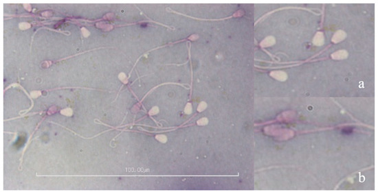 In addition, eosin-nigrosin staining was employed to investigate the viability of sperm from each group, as previously explained. Briefly, a drop of semen (5–10 µL) was mixed in an equal volume of stain on a pre-warmed glass slide. A thin smear of the semen-stain mixture was placed on a new slide and air-dried. We examined 200 sperm per slide, determining whether the membrane was an intact (white staining, Figure 2a) or non-intact membrane (pink staining, Figure 2b).