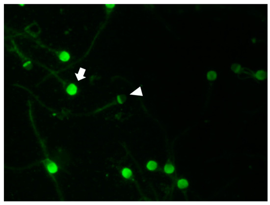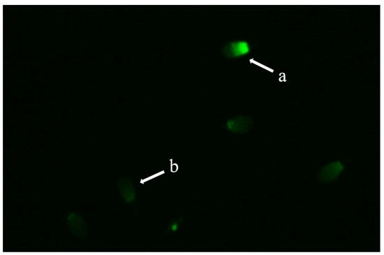 Fluorescein isothiocyanate-conjugated peanut agglutinin (FITC-PNA) was used to assess the integrity of the sperm acrosomal membrane [24]. A post-thaw 30-µL drop of semen was smeared onto a clean glass slide. Air-dried smears were fixed with absolute methanol for 10 min at 20–22 °C and allowed to dry. Staining was performed by spreading 30-µL of FITC-PNA solution (100 µg/mL in PBS) onto each smear. Slides then were incubated in the dark under moist conditions for 30 min at 37 °C, rinsed with PBS, air-dried, and mounted with glycerol. Sperm acrosome status was examined using an epifluorescence microscope (Eclipse Ts 2, Nikon). At least 200 sperm per slide were examined and classified according to the presence (strong green fluorescence, Figure 3) or absence (no fluorescence, Figure 3) of an intact acrosome.