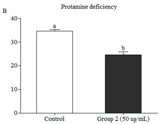 Protamine-deficient sperm were identified by staining with CMA3. The post-thaw evaluation showed a significantly lower percentage of protamine-deficient in exosome-treated than control samples (24 ± 1.3% vs. 34.5 ± 0.7, respectively) (Figure 5).
