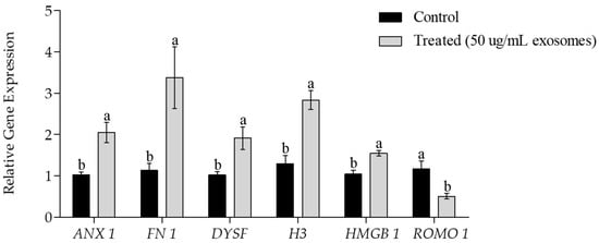 Expression of the plasma membrane repair-related genes annexin 1 (ANX 1), fibronectin (FN 1), and dysferlin (DYSF); the chromatin repair-related genes histone H3 (H3) and high mobility group protein B (HMGB); and a mitochondrial ROS modulator (ROMO 1) as determined by the real-time RT-qPCR in exosomes treated and untreated sperm. Data are presented as the mean ± SEM. Different lower case letters, a, or b represent a significant difference p < 0.05.
