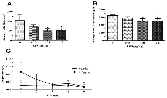 Effect of 2.5 μg /kg body weight lipopolysaccharides (LPS) on (A) average daily gain, (B) average daily feed intake and (C) rectal temperature in lambs. Values are expressed as means ± SD. * p < 0.05, ** p < 0.01, and *** p < 0.001, compared with the control group.