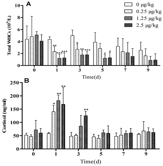 Effect of 0.25, 1.25, and 2.5 μg/kg LPS on (A) white blood cells (WBCs) and (B) plasma cortisol concentration in lambs. Values are expressed as means ± SD. * p < 0.05, ** p < 0.01, and *** p < 0.001, compared with the control group.