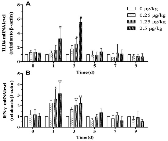 Effect of 0.25, 1.25, and 2.5 μg/kg LPS on expression of inflammatory markers in blood of lambs. (A) Toll-like receptor-4 (TLR4) and (B) Interferon-γ (IFN-γ). The values are normalized to control values and expressed as means ± SD. * p < 0.05, ** p < 0.01, and *** p < 0.001, compared with the control group.