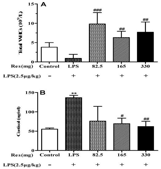Effect of resveratrol on: (A) the number of total white blood cells (WBCs) and (B) concentration of plasma cortisol in LPS-challenged lambs. Values are normalized to control values and expressed as means ± SD. * p < 0.05, ** p < 0.01, and *** p < 0.001, compared with the control group; # p < 0.05, ## p < 0.01, and ### p < 0.001, compared with the LPS treatment.