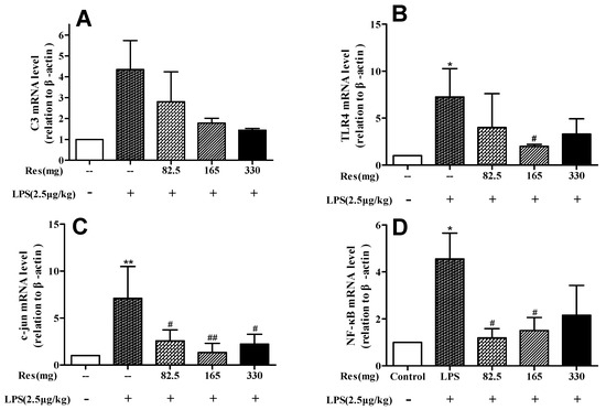 Effect of resveratrol on expression of immune gene C3 (A) and inflammatory markers in peripheral WBCs in LPS-challenged lambs, (B) TLR4, (C) c-jun, and (D) NF-κB. Values are normalized to control values and expressed as means ± SD. * p < 0.05, ** p < 0.01, and *** p < 0.001, compared with the control group; # p < 0.05, ## p < 0.01, and ### p < 0.001, compared with the LPS treatment.