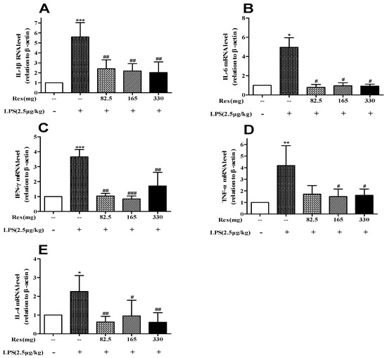 Effect of resveratrol on expression of pro-inflammatory cytokines (A) IL-1β, (B) IL-6, (C) IFN-γ, (D) TNF-α, and (E) anti-inflammatory cytokines IL-4 in LPS-challenged lambs. The values are normalized to control values and expressed as means ± SD. * p < 0.05, ** p < 0.01, and *** p < 0.001, compared with the control group; # p < 0.05, ## p < 0.01, and ### p < 0.001, compared with the LPS treatment.