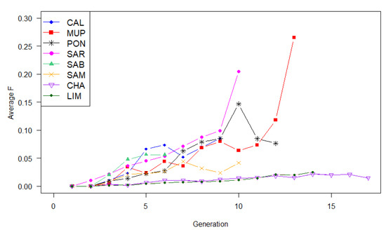 The TMI values were higher in breeds with a PCI lower than 40% (PON, SAR, SAB, and SAM) (Table 2 and Table 4), confirming the underestimation of the inbreeding coefficient when pedigree is incomplete [30]. The level of inbreeding had, in general, a linear increase in local breeds among generations (Figure 1), except for PON where the changes in the number of animals throughout generations produced an erratic trend.