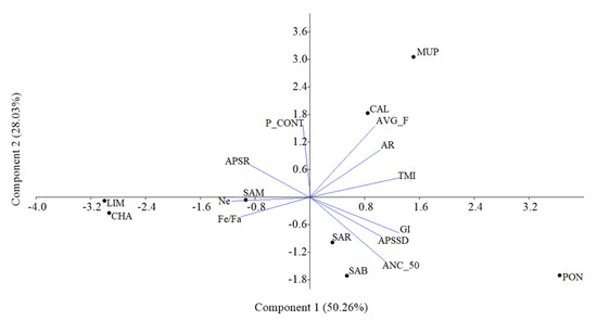 Principal component analysis (PCA) summarizes correlated variables into a reduced set of mutually uncorrelated variables (PCs, principal components), allowing a dimensionally reduced visualization while keeping a certain amount of the original variance. Each of the PCs contains all the original variables. The PCs are constructed by maximum variability explained in the data and with the constrain to be orthogonal to each other. This helps to summarize information and to better study relationships among the samples [31]. PCA was performed on a set of population parameters to identify potential differences among the breeds under study. The parameters considered were average inbreeding coefficient (AVG_F), true mean inbreeding (TMI; including only the animals with at least three complete generations traced), GI, ANC_50, average relatedness (AR), average pedigree content (P_CONT), and Ne calculated based on equiGen. Moreover, the relative change of population size, expressed both as average population size ratio (, where N is the total number of animals per year and y = {2000, …, 2016}), and average standard deviation of population size ratio (APSSD), were included. Past software was used for the PCA [32].