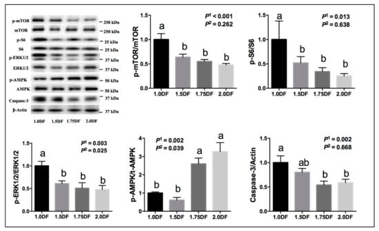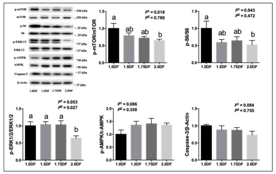 Effects of dietary fiber intake levels on the protein expressions of ovarian tissues in gilts on day 30 of the experiment. Data are expressed as means ± SE; n = 6; DF, dietary fiber; P1 denotes linear effects; P2 denotes quadratic effects; a,b denotes p < 0.05.
