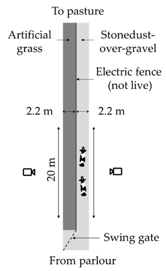 Cows were tested in pairs, as testing them individually was expected to lead to problems that would hamper the analysis of their normal walking speed (e.g., stalling, trotting). The pair exited the dairy parlour and proceeded towards the experimental laneway at their own pace. One person followed them at an approximate distance of 5 m until the cows had reached the start of the laneway, and urged the cows on with minimal vocal stimulation and gestures if they stopped before entering the laneway. The next pair was released as soon as the prior pair had passed to the end of the 20-m observation stretch. The swing gate at the start of the laneway blocked access to one of the two sides. The gate was switched after 10 pairs of cows had passed, thus alternately letting 20 cows proceed over the artificial grass and the stone dust-over-gravel side.
