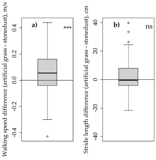 Difference in dairy cow walking behaviour on artificial grass and a standard surface (stone dust-over-gravel), based on 69 pairs of observations. (a) Difference in walking speed; (b) difference in stride length. *** Significant difference between surface types (p = 0.001), ns: No significant difference between surface types (p > 0.10).