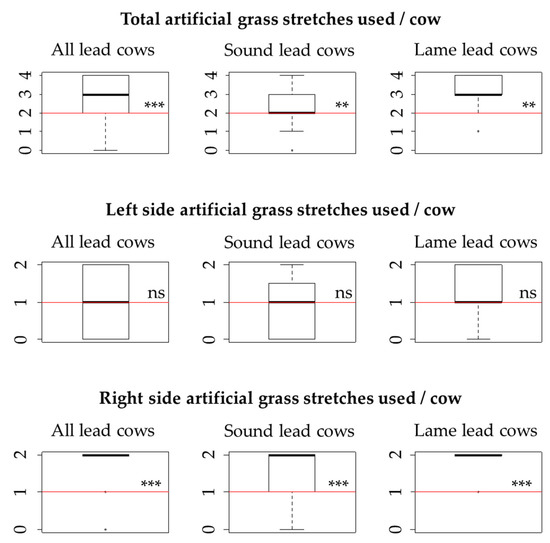 Median number of artificial grass stretches used by lead dairy cows compared to the number expected by chance (expected number displayed as a horizontal line filling the entire width of the frame). The total sample size was 66, including 43 sound lead cows and 19 lame lead cows. The maximum number of artificial grass stretches that could be used was four for the analysis including all stretches, and two for the analyses using either the left-side stretches or the right-side stretches. ** Significantly different from expected values, p < 0.001. *** Significantly different from expected values, p < 0.01. ns: No significant difference, p > 0.10.