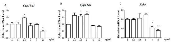 Leptin regulates the expression of E2 synthesis-related genes of Cyp19a1, Cyp11a1, and Fshr in a dose-dependent manner in granulosa cells after exposure to leptin (0, 0.1, 0.5, 1, 5, and 10 ng/mL) for 24 h. (A–C): relative mRNA expression of Cyp19a1, Cyp11a1, and Fshr, respectively. Statistics are showed as mean ± SEM (n = 3 per group). Significances are expressed as follows: * p < 0.05, ** p < 0.01.