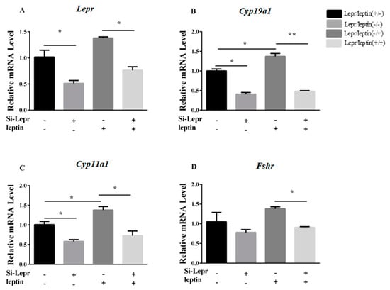 The interference of Lepr impaired the action of leptin on synthesis genes. After treatment with Lepr siRNA for 24 h, granulosa cells were cultured with or without leptin (0.5 ng/mL) for 24 h. The transcription levels of Lepr, Cyp19a1, and Cyp11a1 were determined by qRT-PCR. (A–D): relative mRNA expression of Lepr, Cyp19a1, Cyp11a1, and Fshr. Statistics are presented as mean values ± SEM (n = 3 per group). Significance values are expressed as follows: * p < 0.05, ** p < 0.01 (si-Lepr: Lepr siRNA treatment group, NC: negative control group).